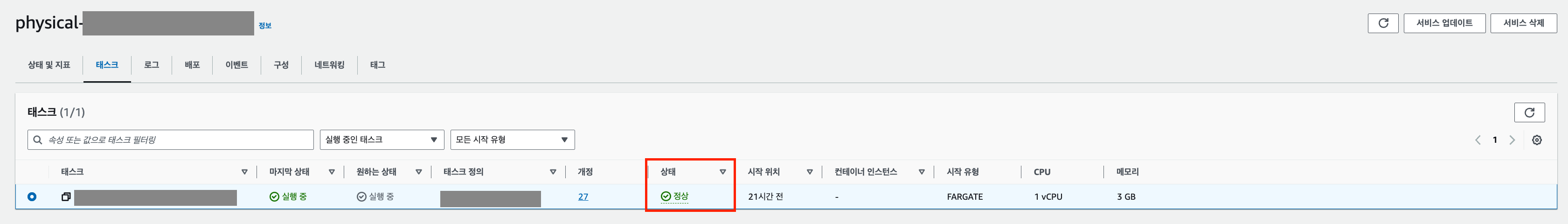 서비스를 클릭해서 들어간 뒤, 태스크 탭을 눌러보면 현재 배포된 태스크를 확인할 수 있다.