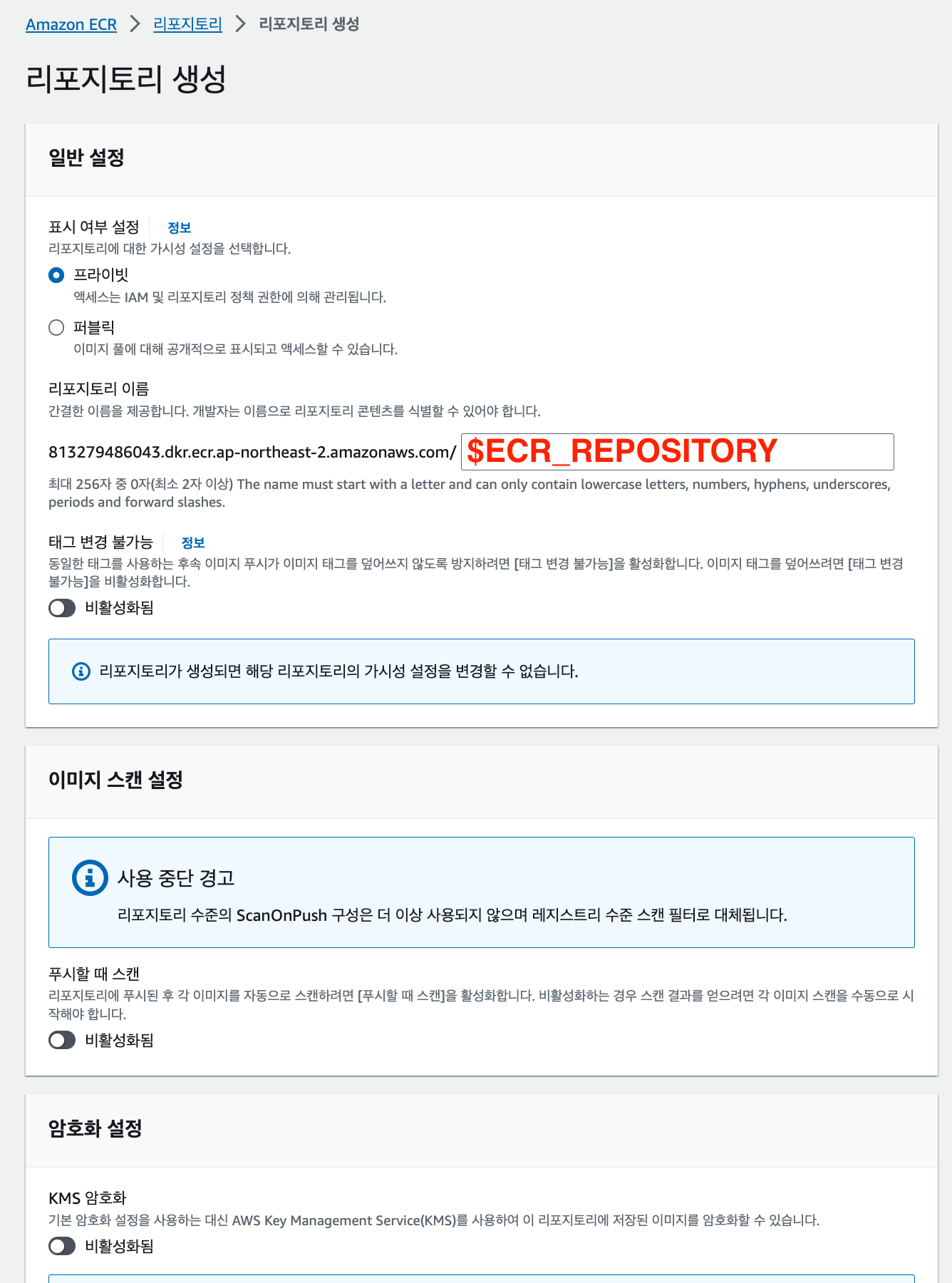 (태그 변경 불가능 기능은 초기 배포설정할 때는 활성화하지 말자... 첫 배포환경 구축할 때는 동일한 태그로 배포할 일이 생각보다 많았었는데, 괜히 이 설정을 ON 해둬서, 다시 풀어줘야했던 귀찮은 상황이있었다)