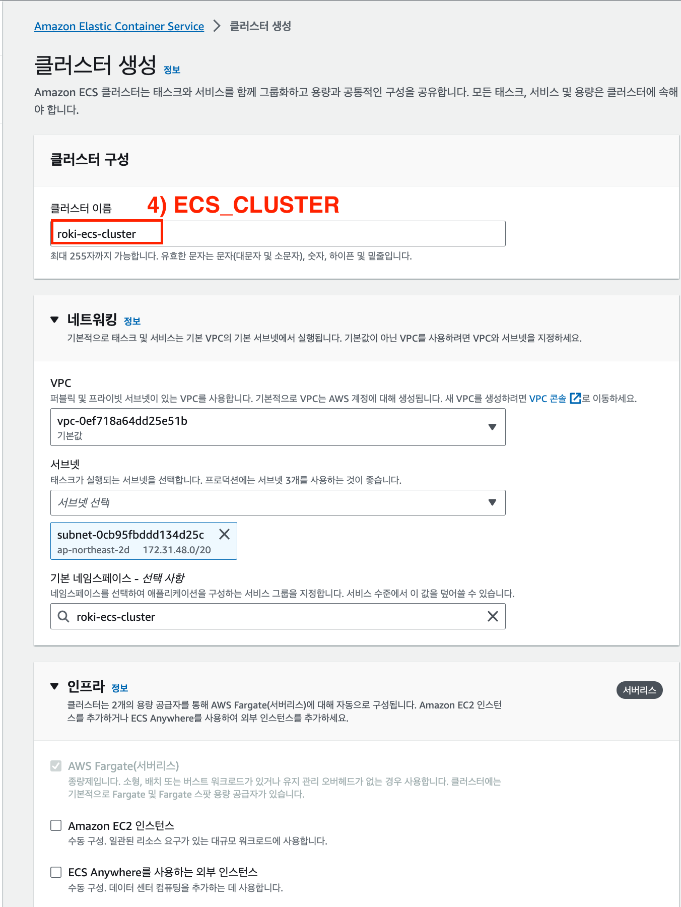 (인프라는 fargate로 설정한다 ⚠️ 요금이 부과된다)